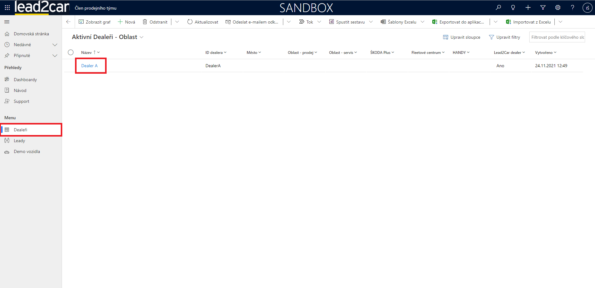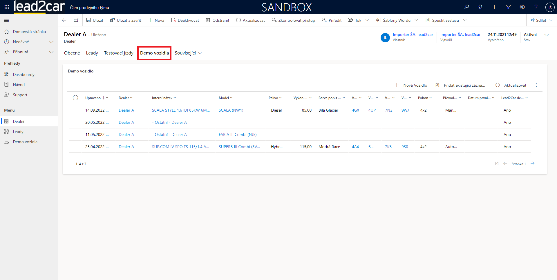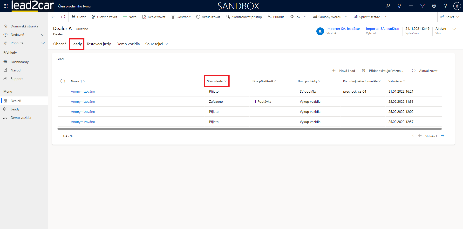 Na kartě Leady je možné vidět všechny leady daného dealera společně s dalšími informacemi o nich. Důležitá informace zde může být Stav-Dealer. Podle něj se dá zjistit kolik leadů zatím nebylo zpracováno, a nebo kolik leadů bylo vyřazeno.