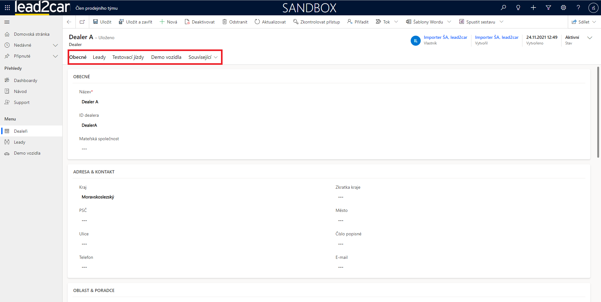Mezi jednotlivými kartami u dealera je možné přecházet pomocí menu nahoře. Jak název napovídá, na kartě Obecné se nacházejí základní informace o dealerství, jako například otevírací doba, adresa, a nebo název. Důležité zde mohou být informace o oblastním poradci pro prodej a oblastním poradci pro servis.