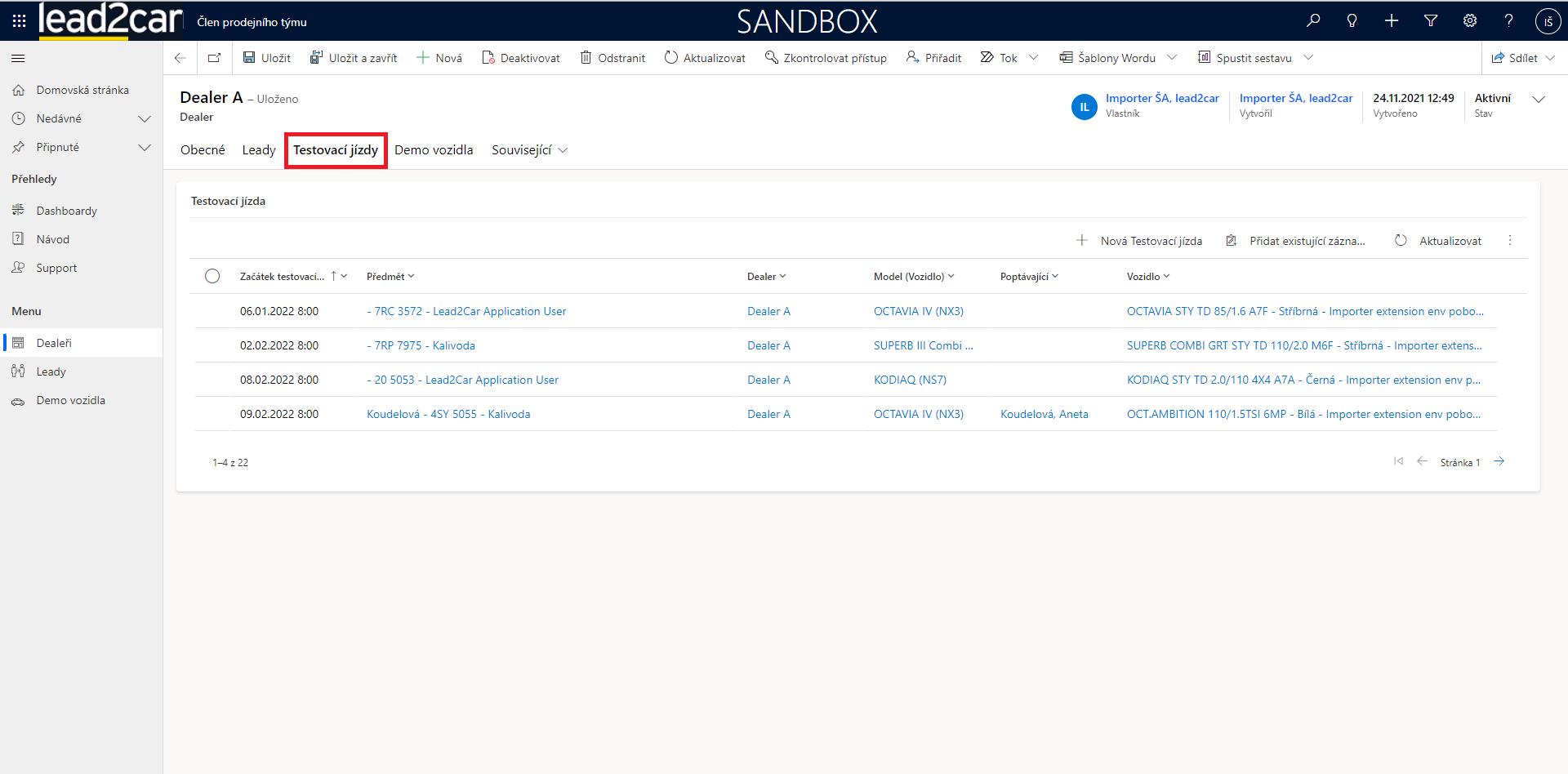 Na kartě Testovací jízdy je možné zkontrolovat všechny naplánované testovací jízdy dealera. Rovnou se zde dá zjistit začátek jízdy, a nebo konkrétní vozidlo.
