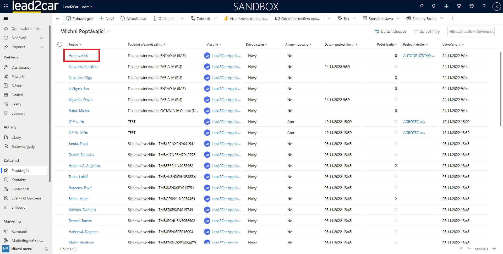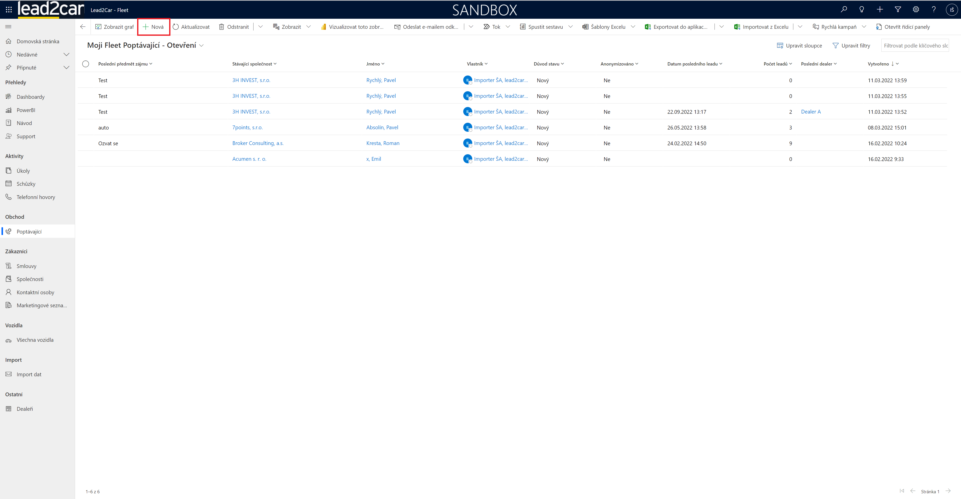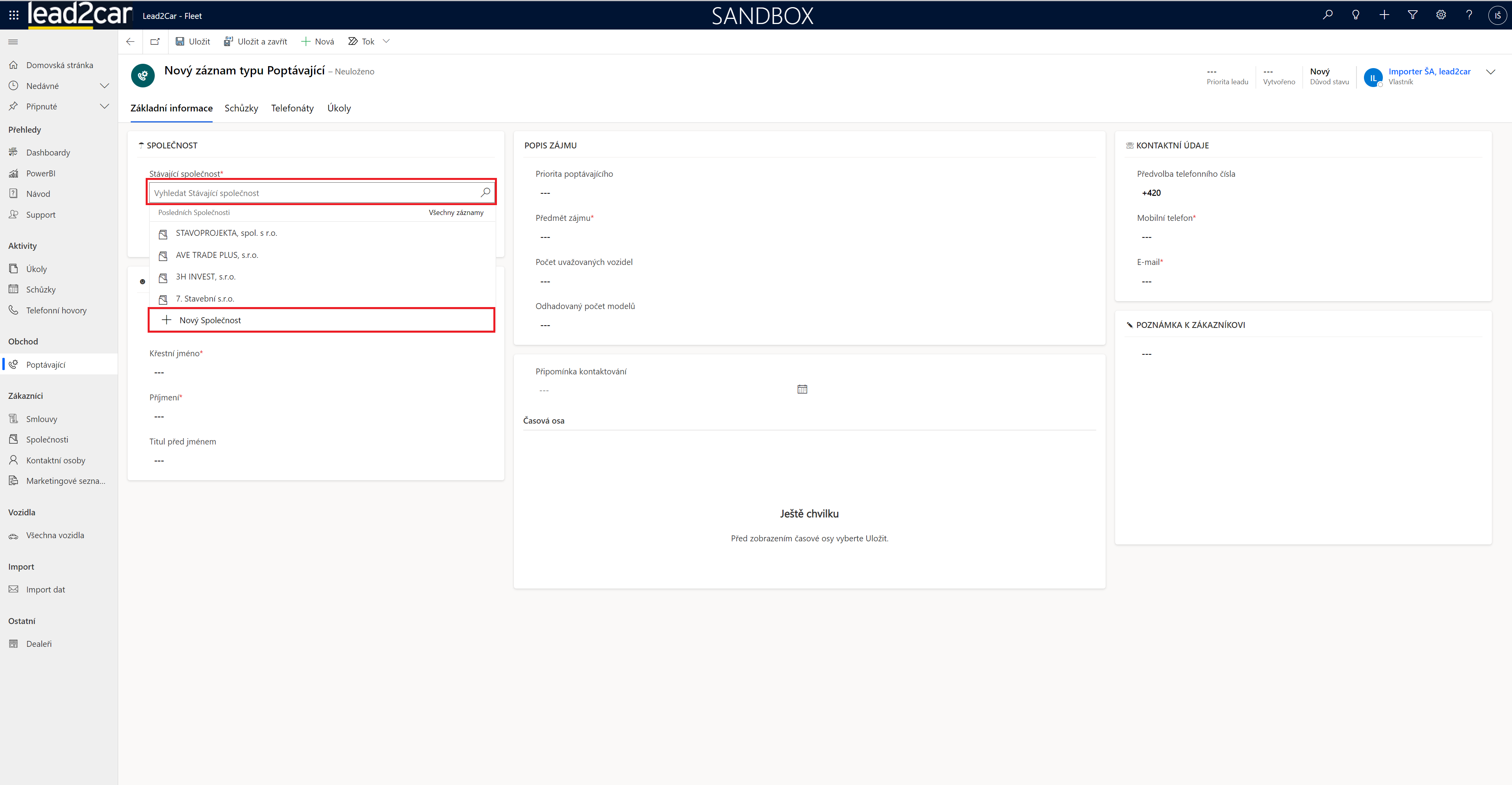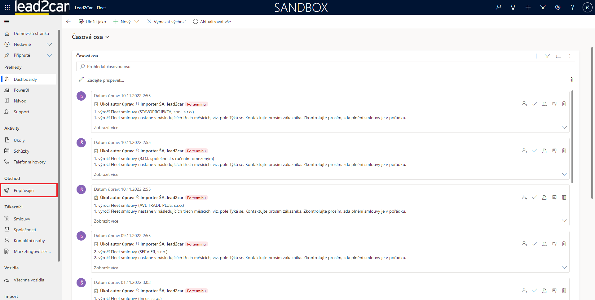 Entita "Poptávající" slouží pro zaznamenávání nových potenciálních zákazníků, o kterých dosud nejsou k dispozici žádné informace. Záznamy mohou být přeneseny z podpor, nebo se můžou vytvářet nové záznamy přímo ve fleetové aplikaci.