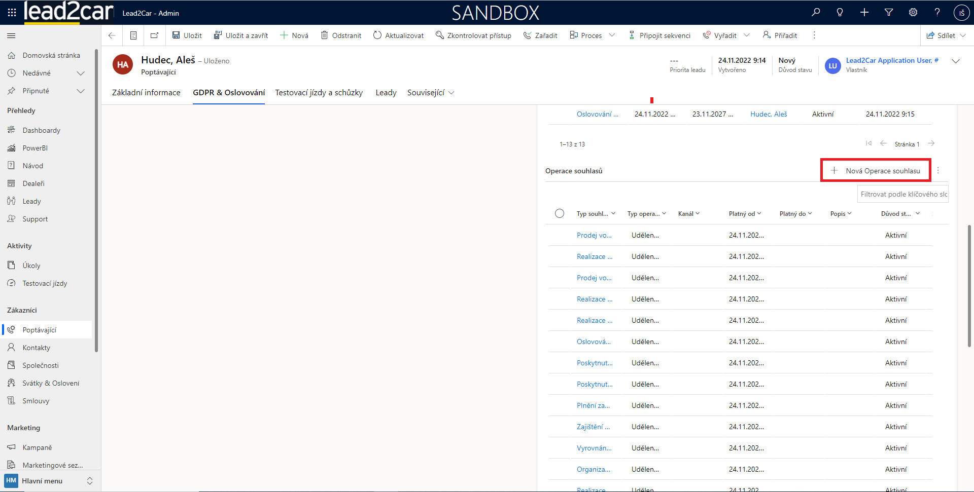 Zde se nachází seznam všech operací souhlasů.Je potřeba zde vytvořit novou operaci pomocí tlačítka nová operace souhlasu.