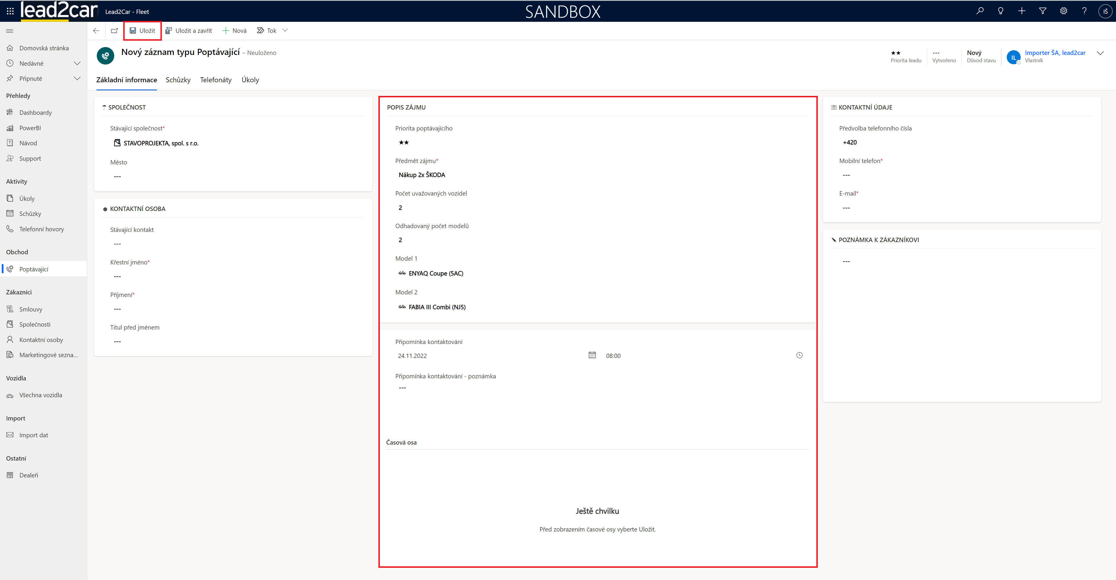 Důležité je vyplnění prostředního sloupce, kde se zadávají údaje o samotné poptávce. První věc je zvolení priority poptávajícího. Dále je vhodné vyplnit předmět, tak aby bylo poznat, čeho se daná poptávka týká. Podle zvoleného počtu modelů se objeví stejný počet řádků s modely, které je možné doplnit ze systému. Vhodné může také být, naplánování připomínky kontaktování, kdy vás systém v daný čas sám upozorní. Poté co máte vše vyplněné, tak můžete poptávajícího uložit, pomocí tlačítka vlevo nahoře.