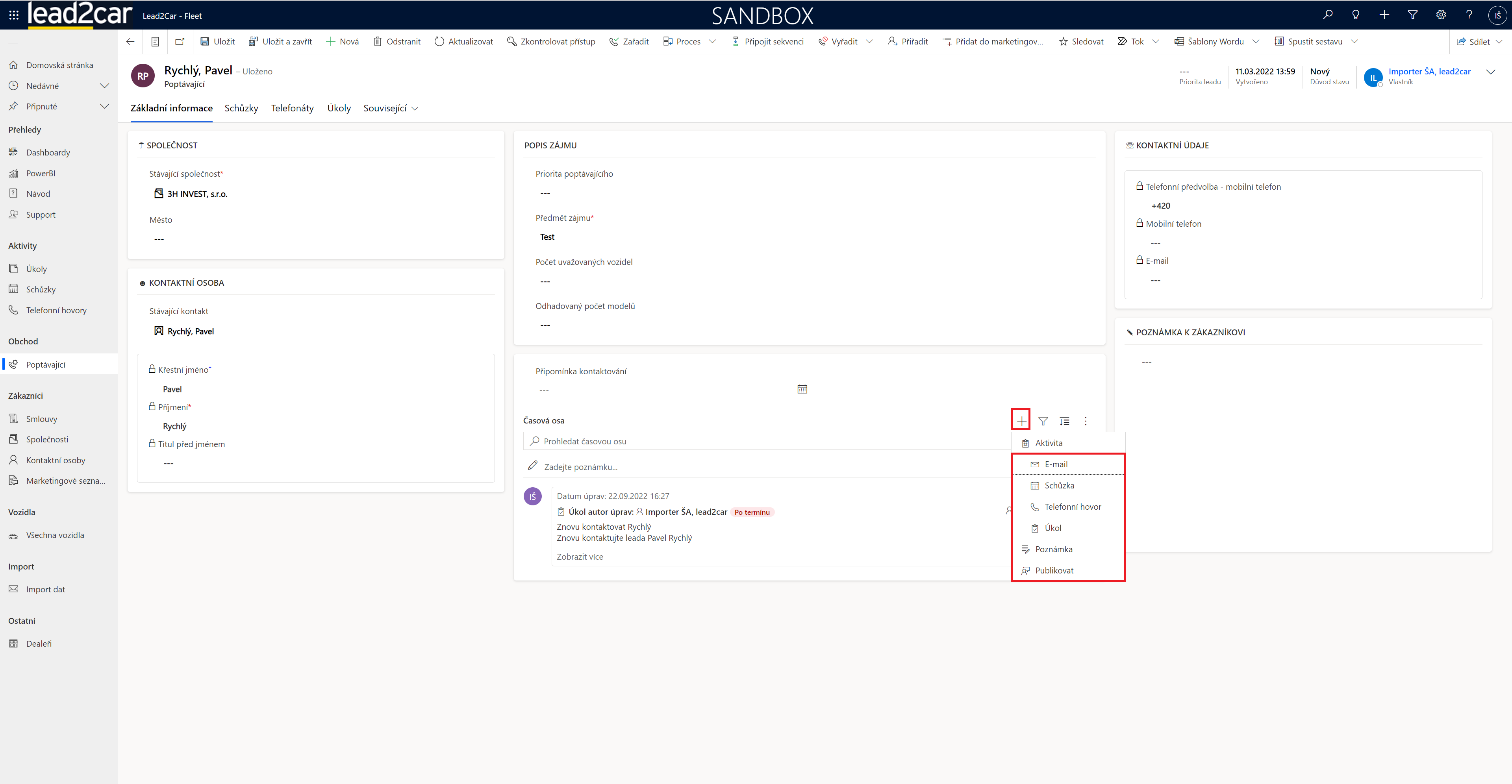 Klíčová pomůcka při práci s poptávajícími je časová osa. Do té je možné přidávat záznamy o komunikaci se klienty. Pomocí ikony + se otevřou možné záznamy, které se dají přidávat. Email v tento moment není propojen s outlookem, takže zatím není nutné si zaznamenávat emaily, případně se dají uvést jako poznámka. Schůzka, telefonní hovor, a úkol se všechny zakládají podobným způsobem. Například při zaznamenávání schůzky se objeví panel napravo, kde se dají vyplnit informace o proběhlé schůzce. Například místo nebo čas schůzky. Poté stačí uložit informace, a záznam o schůzce se objeví v časové ose. Poznámky se kromě standartního způsobu pomocí ikony +, dá také založit pomocí ikonky tužky. Poslední možnost, publikovat je užitečná, protože tam je možné označit kolegy, kterým se následně daný záznam také zobrazí.