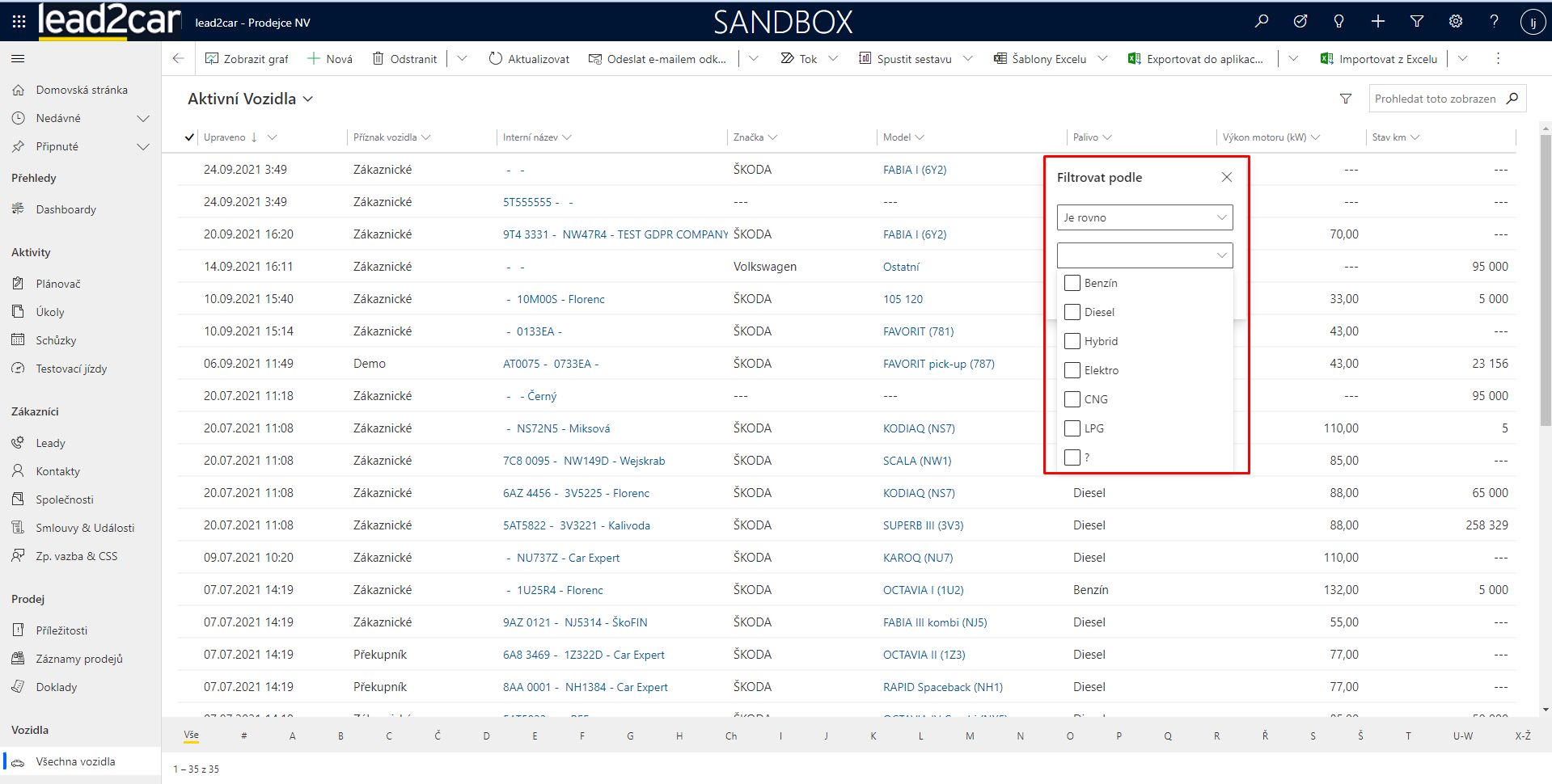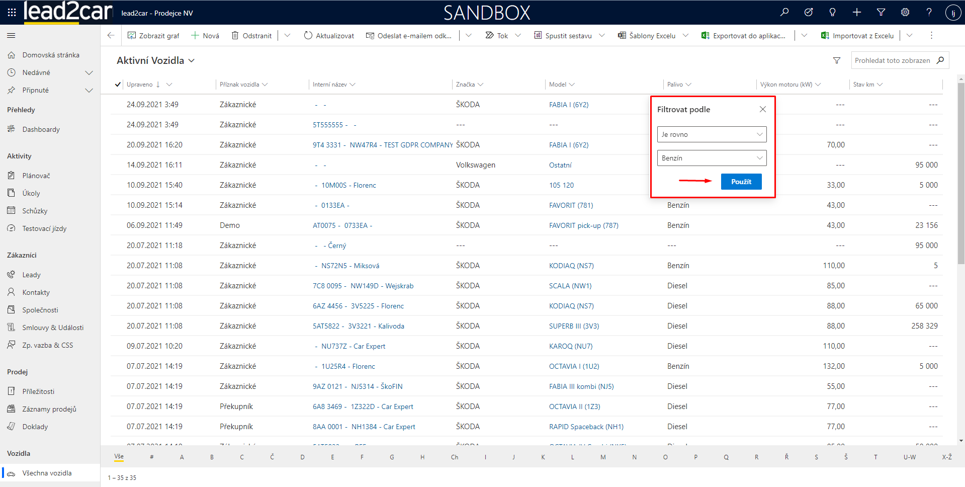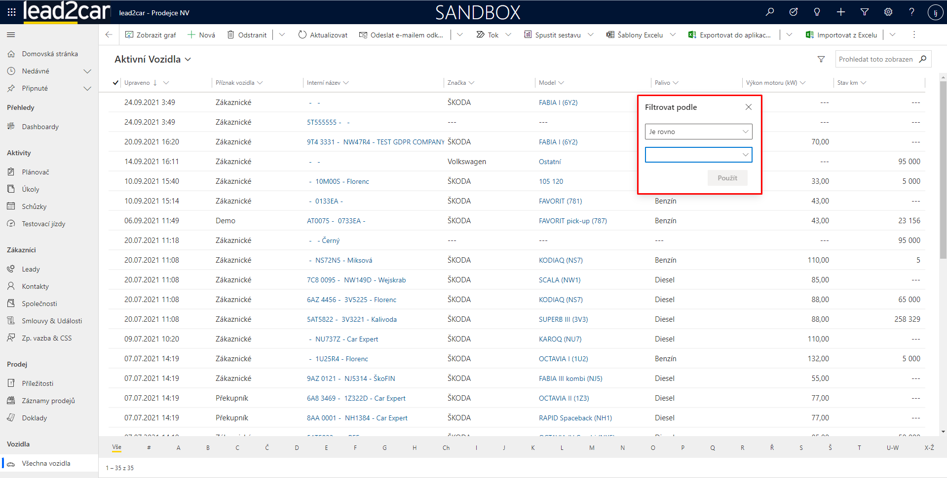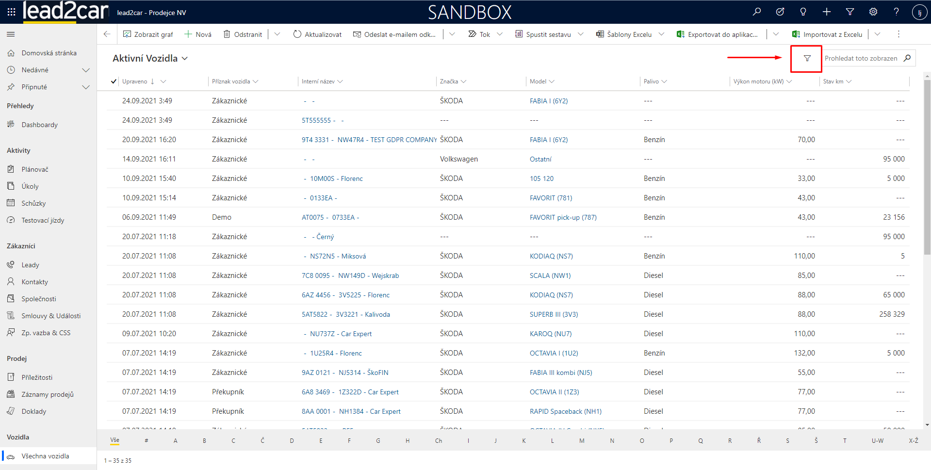 Záznamy se v lead2car dají filtrovat dvěmi základními způsoby. Pokud je přímo na daném zobrazení entity je pole, podle kterého chcete filtrovat, rozklikněte ikonku „šipečky dolů“ vedle názvu pole a zvolte možnost „filtrovat podle“. Poté už jen nastavíte filtr dle vašich potřeb a v zobrazení se Vám ukážou odpovídající záznamy.