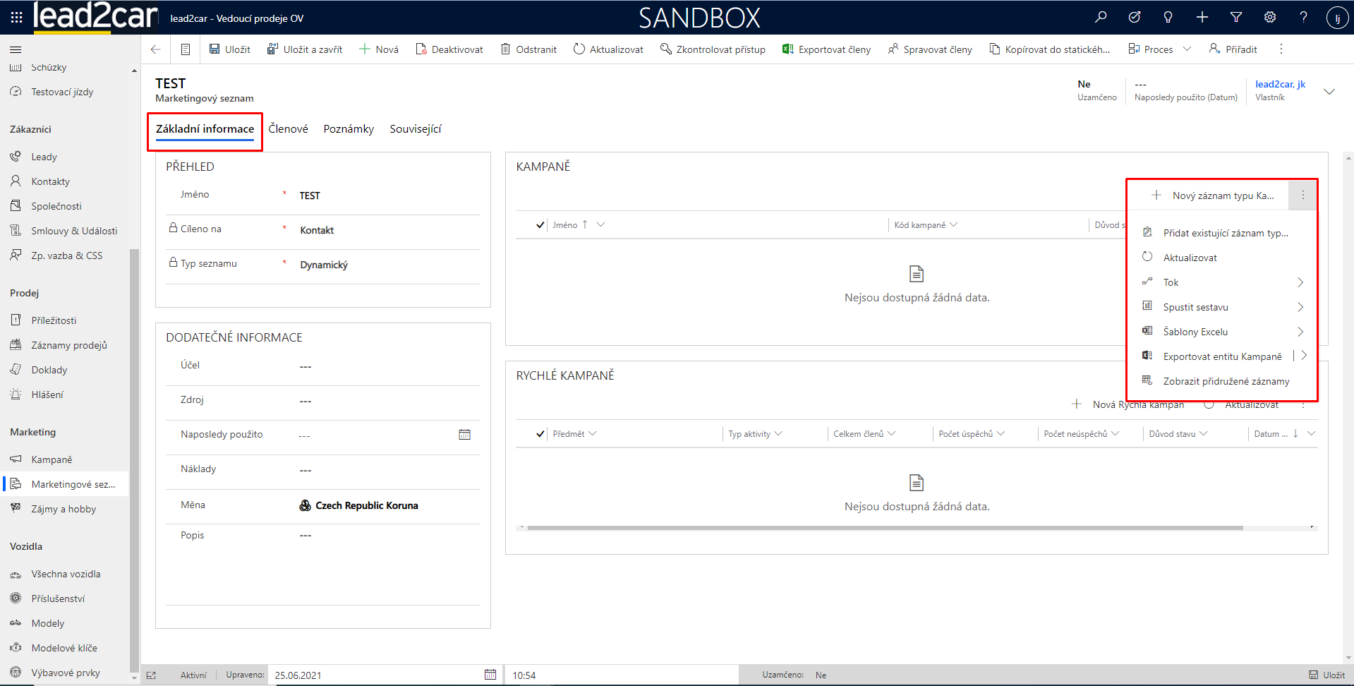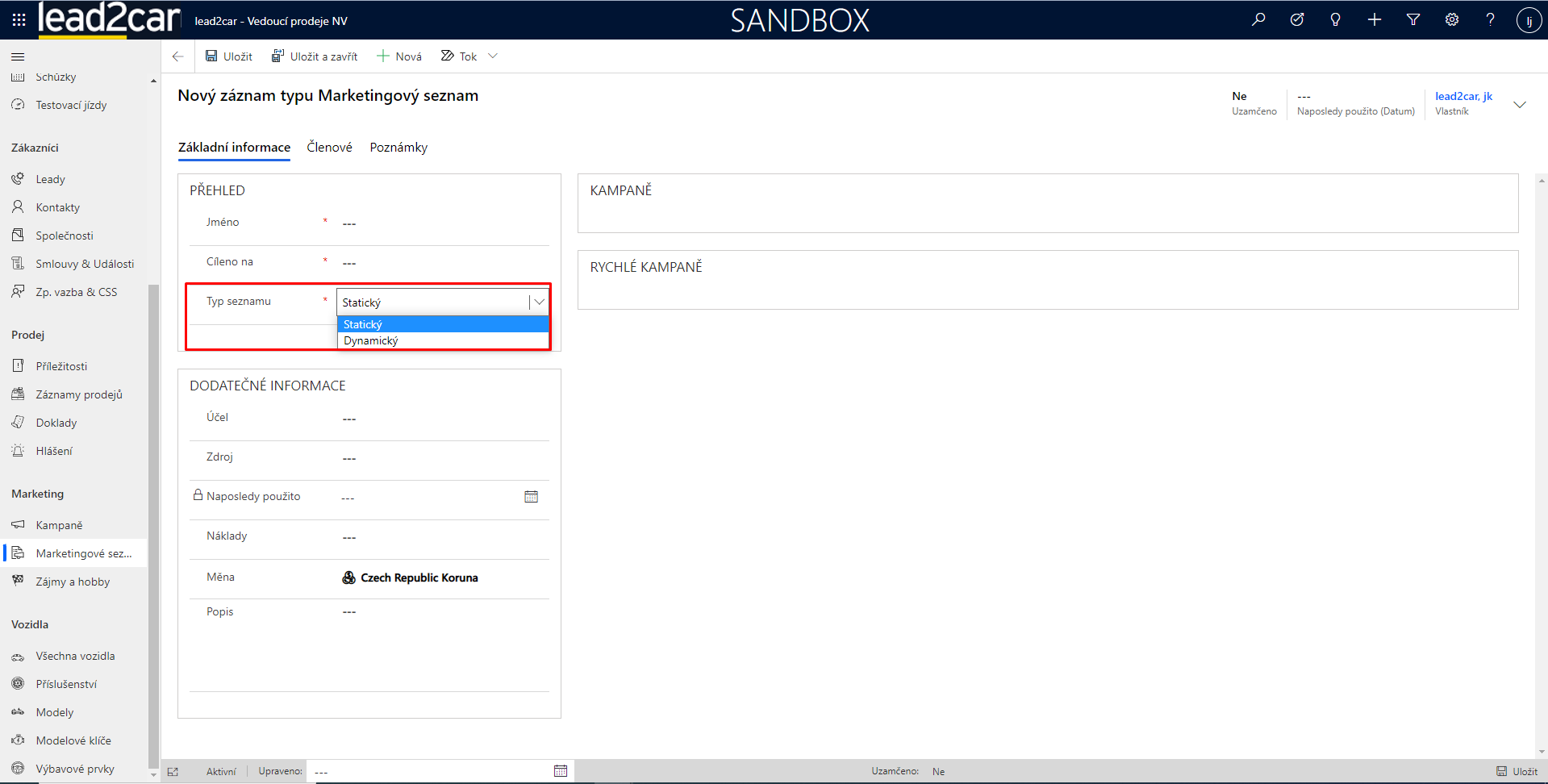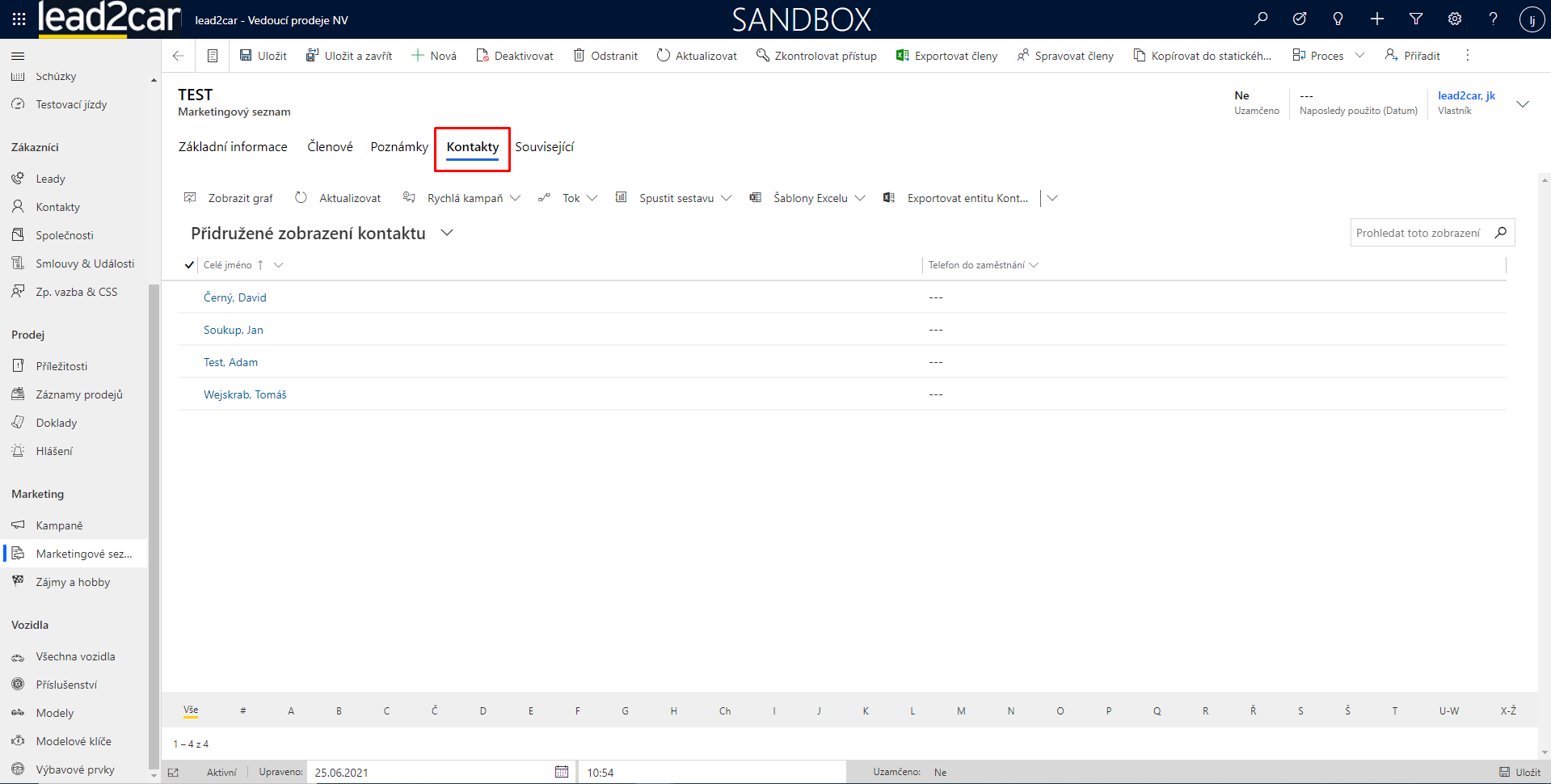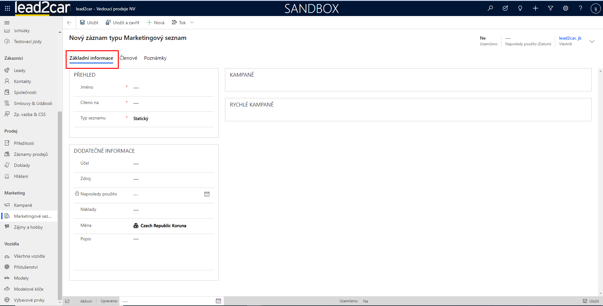 Po rozkliknutí marketingových seznamů v levém menu bude otevřen aktuální seznam.