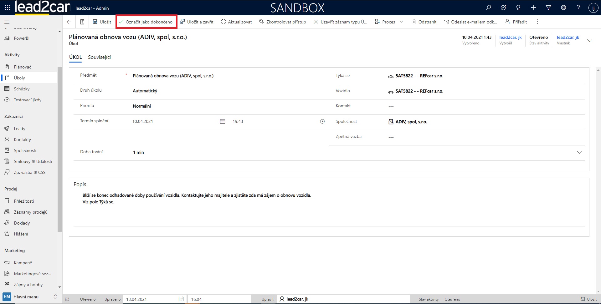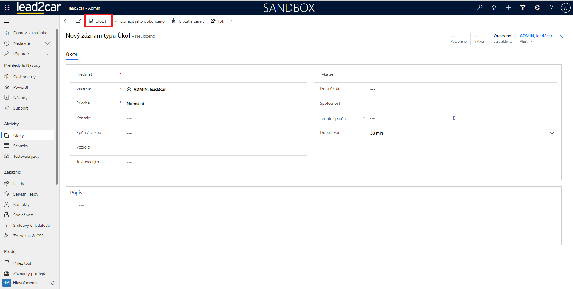 Nyní se otevře formulář pro vytvoření nového úkolu. Je třeba vyplnit pole v tomto formuláři. Důležitý je zejména předmět a termín splnění. Do pole "Týká se" lze vložit kampaň, kontakt, lead, pracoviště, příležitost, smlouvu, společnost nebo vozidlo. Po vyplnění všech požadovaných údajů klikněte na horním panelu na možnost Uložit.