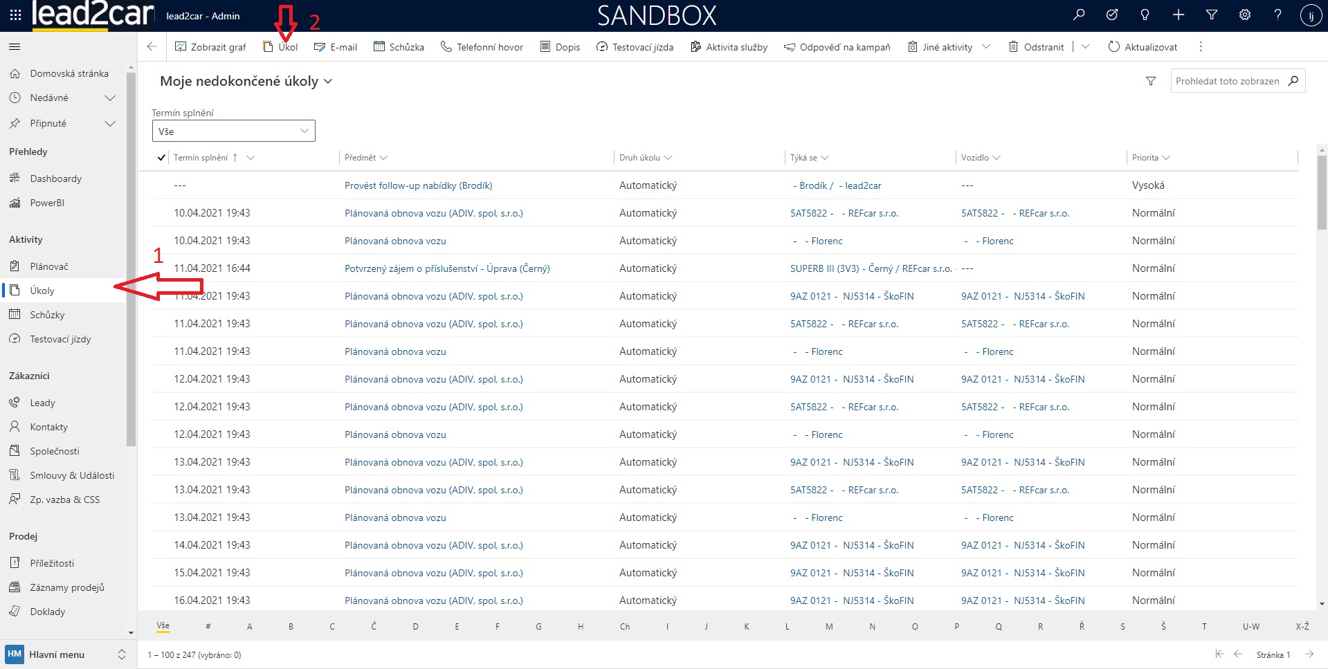 Úkoly jsou v lead2car vytvářeny buď automaticky, případně je možné vytvořit úkol ručně. Pro manuální vytvoření úkolu nejdříve z levého menu vyberte možnost Úkoly. Následně pro vytvoření nového úkolu vyberte z horního panelu možnost Úkol.