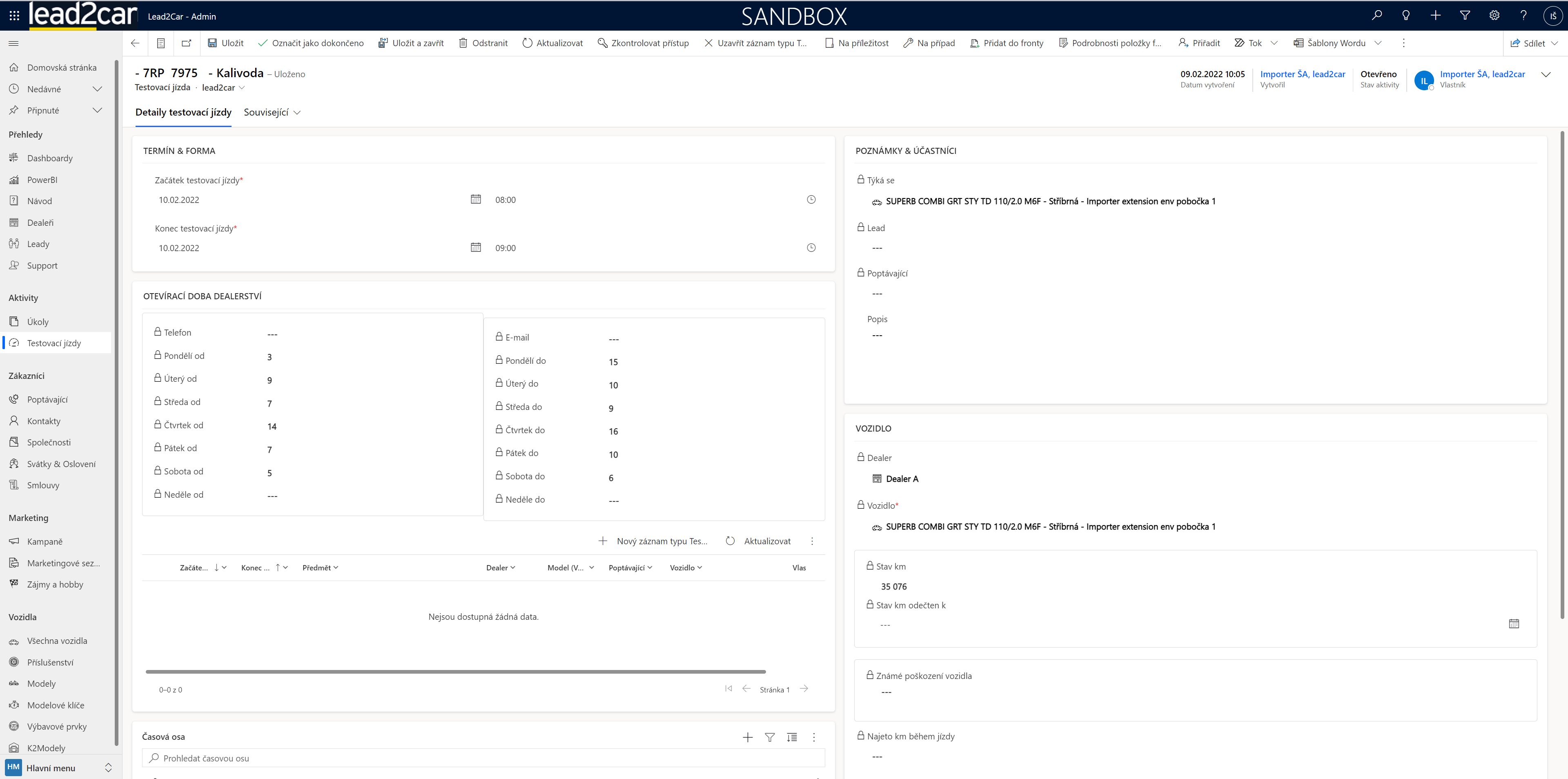 Po otevření testovací jízdy jsou vidět základní informace o ní. V levé části obrazovky jsou informace o začátku i konci testovací jízdy. Také je tam vidět otevírací doba dealerství, a ve spodní části časová osa. Napravo je především vůz na testovací jízdy, a také lead a poptávající propojený s danou jízdou. V pravo dole jsou dále informace o daném vozidle, jako například stav km.