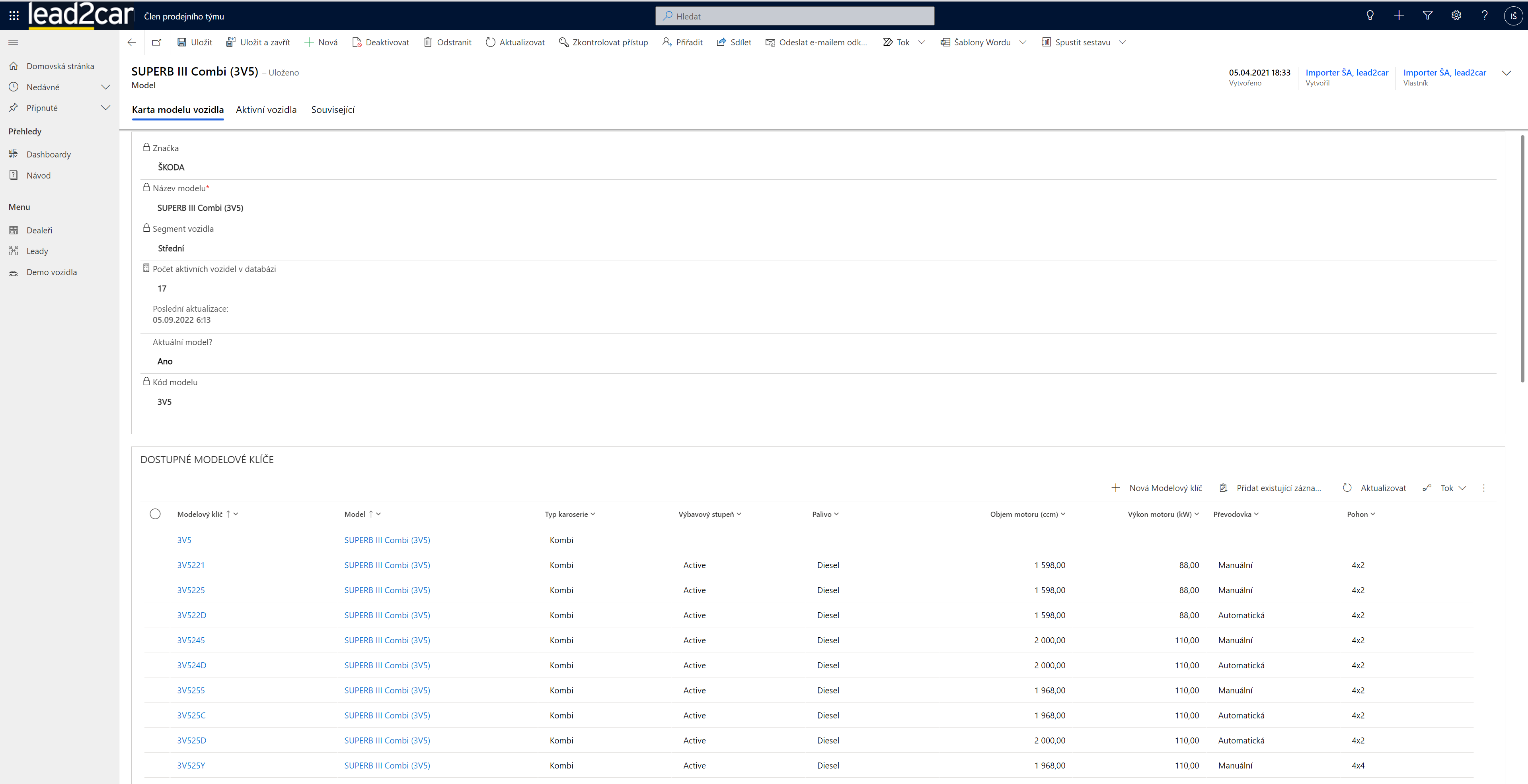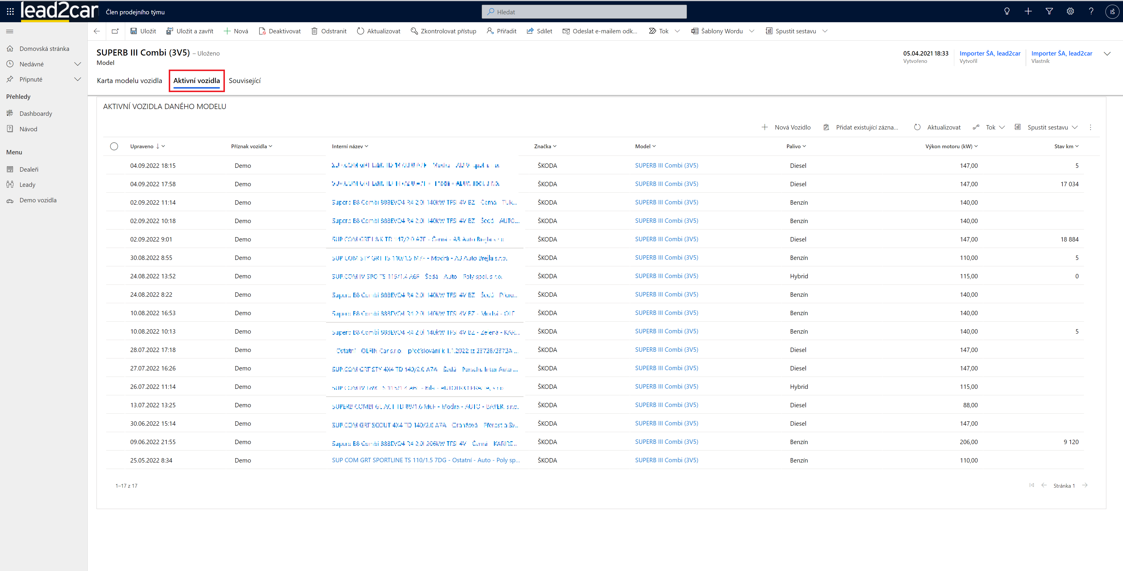 Na kartě aktivní vozidla se nachází seznam všech aktivních vozidel daného modelu.