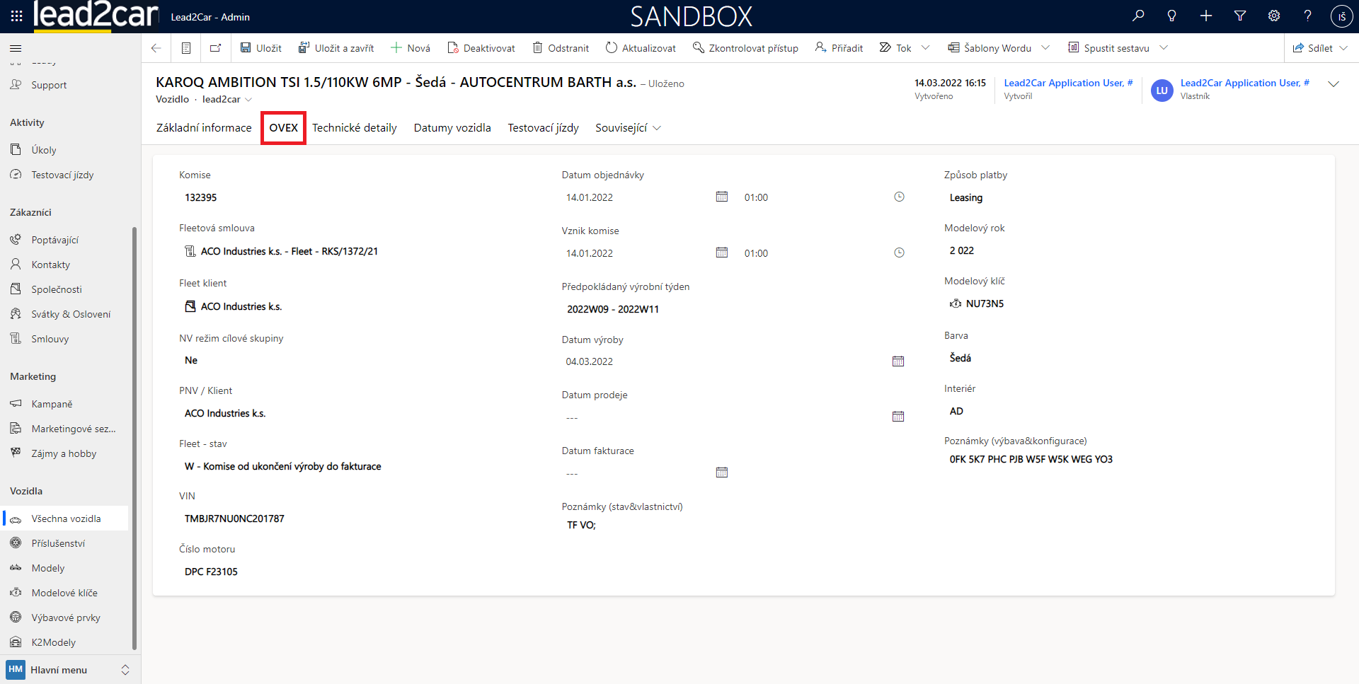 Entita "Všechna vozidla" slouží jako databáze všech fleetových vozidel. Lze zde nalézt podrobnější informace ke konkrétním vozidlům. Také jsou zde informace o jednotlivých modelech a modelových klíčích. Vozidla není třeba vytvářet. Jsou vytvářena z OVEXu.